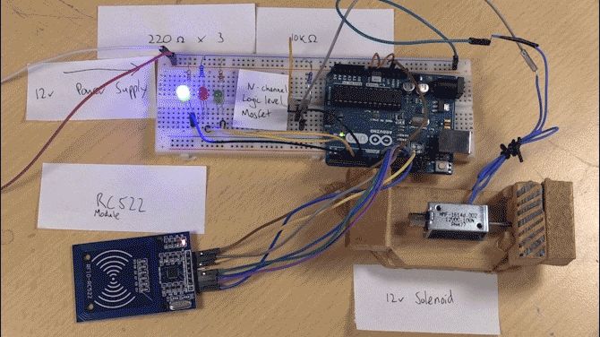 您可以完全取消螺线管,并在其中安装一个LED灯条,并使用RFID激活灯。当可以将具有访问权限的卡或便携式计算机拿到阅读器时,您可以使用相同的想法将Wi-Fi密码之类的数据显示在小屏幕上。