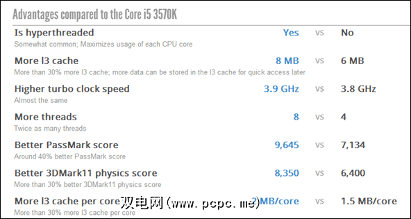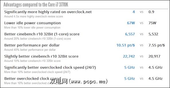 上面您会看到一个特定的i7(3770K,即CPU与i5 3570K相比,我碰巧有自己的工作站。您可以一眼看到价格差距(290美元对215美元),然后向下滚动,可以对两者之间的差异进行相当详尽(非常直观的细分)。
