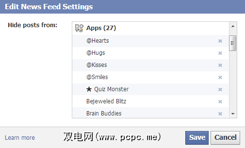 要查看和编辑所有隐藏的朋友,应用程序和页面的列表,请转到您的Facebook主页上,将鼠标悬停在左侧边栏的 News Feed 条目上,单击铅笔图标,然后选择 Edit Settings 。不幸的是,您只能取消隐藏人,应用程序或页面,但不能添加任何内容,尽管那样很舒服。