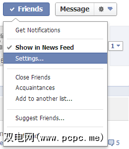转到Facebook朋友的个人资料,然后单击 Friends 按钮。确保选择了在新闻源中显示选项,然后单击下面的设置选项。