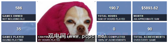 在此页面的顶部,将向您显示统计信息的快速摘要。 。这包括您拥有的游戏(无DLC),玩过的游戏,玩过的总时数,成就总数,完成的游戏以及近似的帐户价值。它也会对您的Steam头像进行分层,就像您看到的那样(我的狗(这是在反恐精英一轮被杀死后,最能出现在您脸上的头像)之一。)。