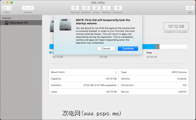 硬盘性能不佳会导致关机缓慢。幸运的是,这很容易在macOS中检查和修复。只需打开内置的 Disk Utility 应用程序,在左列中选择您的驱动器,然后单击急救。