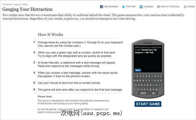 分心驾驶《纽约时报》(New York Times)的系列四年前问世。它仍然很重要,因为我们的不良驾驶习惯不会很快消失。控制您的注意力分散了数字时代最危险的疾病之一,这种疾病正在全世界范围内肆虐-开车时发短信。有很多应用程序可以帮助您在开车时使用手机,但我希望每个人都遵循真正需要的唯一内容–请勿在开车时使用手机。这个简单的游戏衡量您分心时的反应时间,并试图显示在开车和发短信时多任务处理的危险。