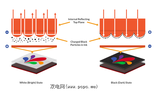 “ E Ink使用两粒子系统生成黑白图像。为了产生白色,E Ink使用白色粒子反射光。而CLEARink仅使用一个粒子-黑色-产生黑色状态。为了产生白色,CLEARink在正面使用了TIR(全内反射)膜。