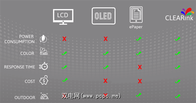 CLEARink技术看起来像E Ink,但有一些大的差异。虽然两者都共享一种基础技术(电泳),但CLEARink背后的秘密在于与默克公司共同开发的新型墨水和反射面板。与LCD,OLED和电子纸的比较方式如下: