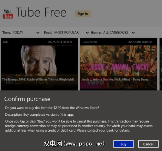 即使是看起来无害的应用程序也可能会受到质疑。例如,商店的“娱乐"部分中最受欢迎的应用之一就是Tube Free。这个应用程式为YouTube提供了Metro风格的介面(Google没有正式的「地铁」应用程式),可能会很有用。但是,如果您要登录自己的帐户,该应用会要求您支付2.99美元。