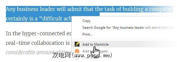 2。在文章上,选择要标记的文本片段。单击键盘上的字母 M 以保存标记的位置。另外,您可以右键单击并选择添加到Markticle 。