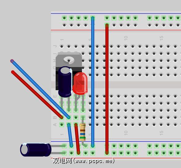 本节的目的是采用7-12v电源(通常为9V DC插头)并将其调节至5V 。微控制器芯片需要。左断开的红色和蓝色导线应连接到您使用的任何输入电源,但绝对不要使用超过12v的电压,否则您将被炸掉。另外,此时将顶部和底部导轨连接在一起。