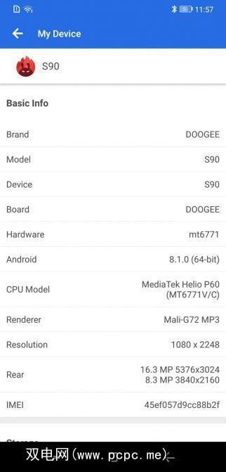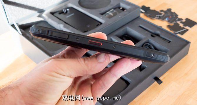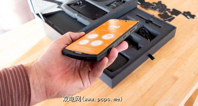Doogee S90的IP68防护等级,这要归功于SIM卡插槽和USB-C端口上的橡胶盖。每个角落的保险杠以及沉重的金属轮圈提供一定程度的防摔保护。该设备重10.6盎司(300克),尺寸为6.33 x 3.14 x 0.6英寸(170 x 80 x 15毫米),因此它是笨重的设备,重量几乎是某些小型手机的两倍。造成这种差异的原因是大容量内部电池和6.18英寸大屏幕。