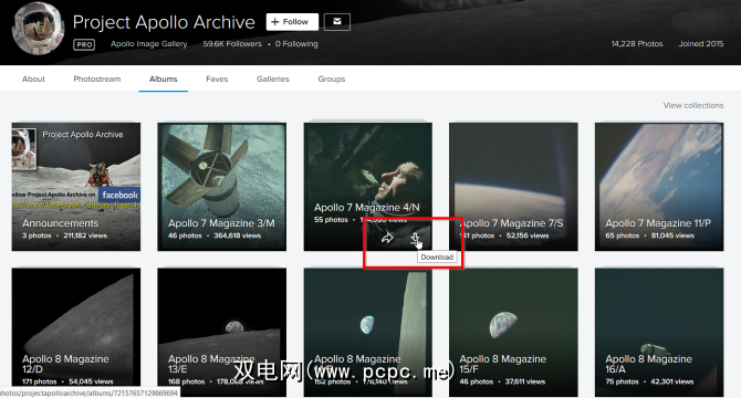 要下载另一位Flickr成员的图片,请单击其用户名,然后选择相册。将鼠标悬停或单击相册缩略图以显示下载图标。单击此按钮,然后选择创建zip 文件。一段时间后会出现一个下载链接。