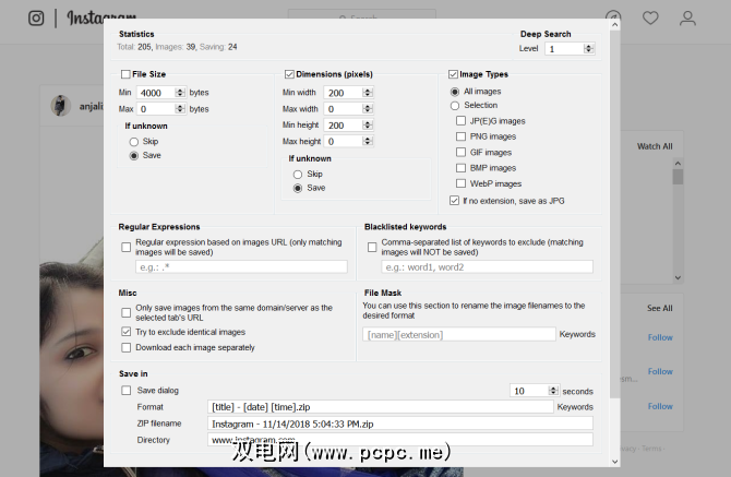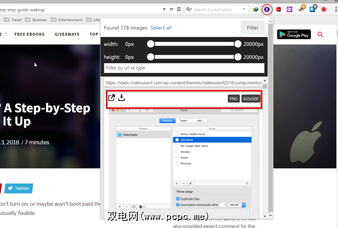 为Firefox下载所有图片,可以在打开的选项卡中查找,过滤和保存所有图片。过滤工具功能强大。您可以根据图片的尺寸,大小和图像类型对其进行限制。但是,您还可以使用自定义正则表达式过滤器根据URL过滤图像。