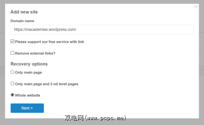 Wayback Machine Downloader可使您从Internet Archive下载任何网站。注册该帐户,然后点击添加新站点按钮。键入域名,指定要保存的站点页面级别,然后从下拉菜单中选择快照日期。