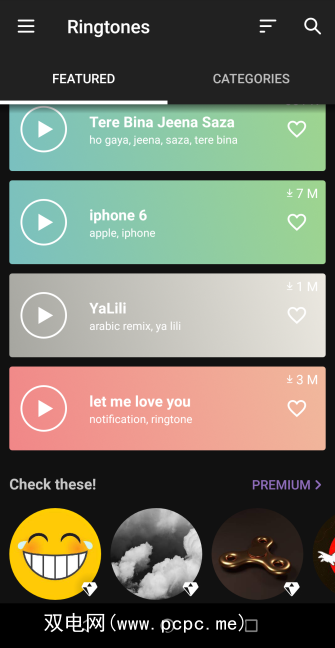 Zedge有超过百万个免费铃声可供通过其网站或应用下载。它带有内置工具,可以将喜欢的铃声保存在个人列表中,并可以从任何设备访问它们。下载铃声后,点击设置按钮将其设置为铃声,通知声音和单个联系人铃声。