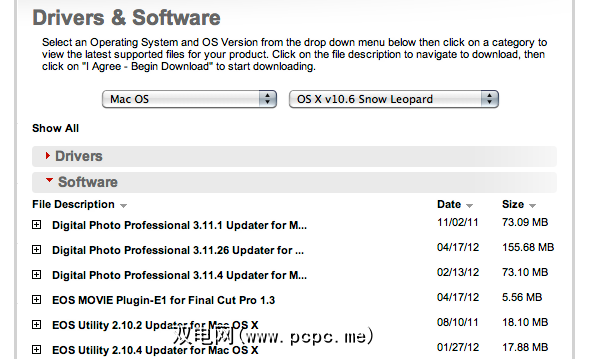 在您的型号附近单击“ Drivers&Software"(驱动器和软件)的位置,您会被吸引到一个神奇的地方在本地人向您打招呼“ “您的操作系统和版本是什么?" 的地方。自然,您应单击“ Mac"选项,然后将为您提供所有OSX版本。佳能自从黎明起就有每一个EOS Utility更新,因此您可以准确找到所需的内容。