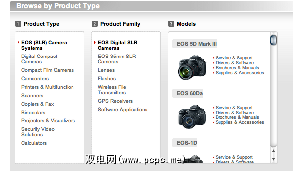继续,然后在另一个选项卡或窗口中打开佳能网站的“佳能支持和驱动程序"部分。在产品类型部分中,确保您使用的是EOS Digital SLR选项。之后,滚动浏览并找到您的相机型号。