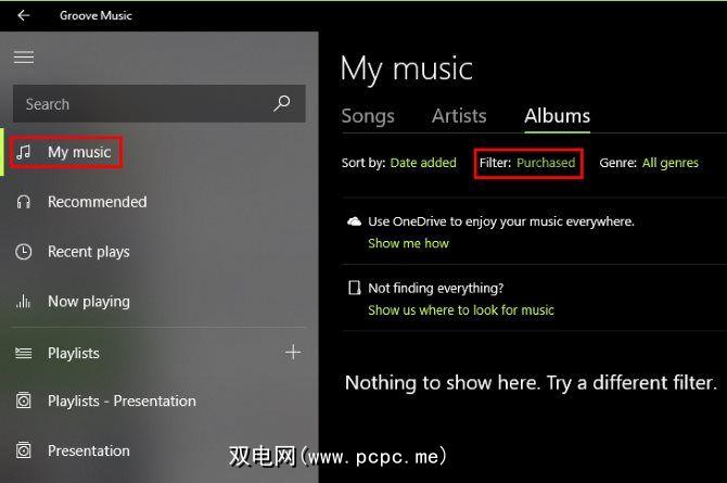 您会在屏幕顶部附近看到一个过滤器链接。这里的窗户。默认情况下,它可能显示全部。单击此按钮,然后将其更改为已购买,以仅显示您从Groove商店购买的音乐。如果没有显示任何内容,则您会很清楚。
