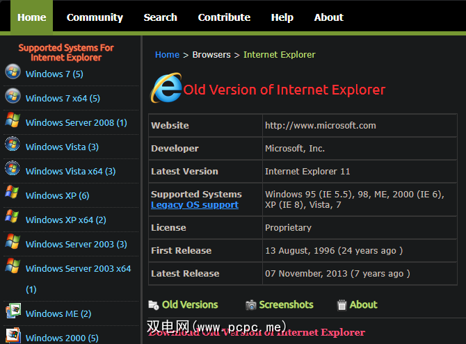 前往OldApps的Internet Explorer页面下载所需的版本。不过,您会发现所有版本都可以追溯到Internet Explorer3。不过,请密切注意每个版本支持的平台。您无法在Windows 10上原生运行低于IE11的任何功能,因此您将需要一个虚拟机(如下文所述)。