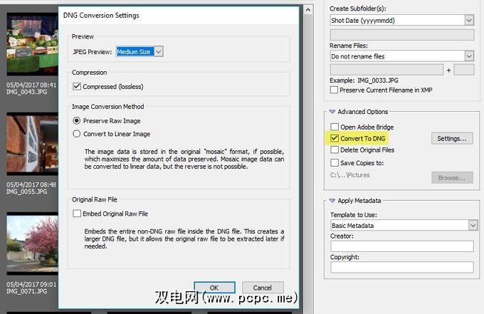 “ DNG转换设置"窗口允许您更改四个设置。如果要为图像创建JPEG预览,可以在中和完整尺寸之间进行选择。您也可以选择无以防止生成JPEG预览。选中“压缩"复选框将压缩图像以减小文件大小。