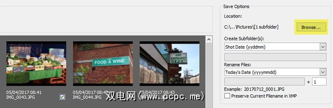 桥也可以将照片导入您所选位置的子文件夹中。使用下拉菜单,您可以在四个选项之间进行选择:无,自定义名称,今天的日期和拍摄日期。