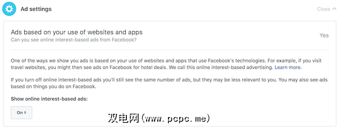 第一个选项是根据您使用的网站和广告(基于用户兴趣的在线广告)向您显示广告,可以将其切换为打开或关闭。如果启用,Facebook将显示与您的兴趣相关的广告。