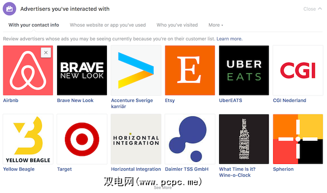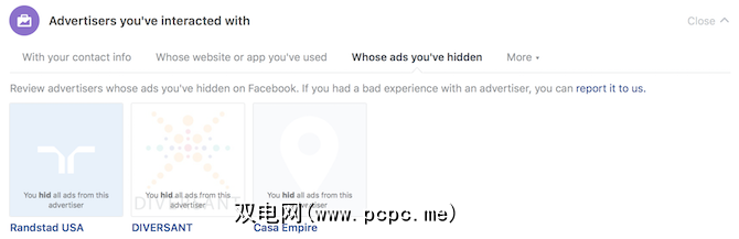 Facebook还可以自由地向您显示广告客户您曾经使用过的网站或应用 ,您访问过的人,您点击过的广告和您隐藏的广告。您可以随时从此处随时更改广告主的想法。