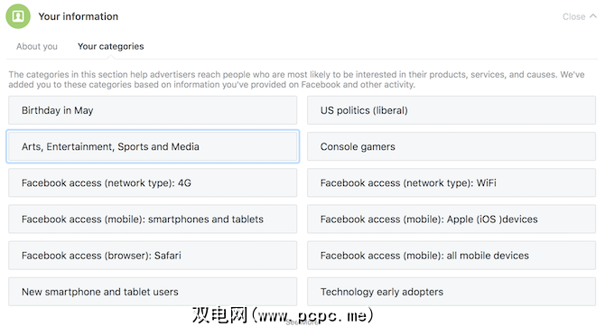您信息的另一部分是您的类别。 Facebook会根据您在Facebook上提供的信息以及通过其他活动自动选择这些“类别"。