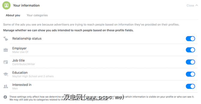 通过您的信息字段,您可以看到广告商可以访问的关于您的信息。这包括关系状态,雇主,职位,教育和感兴趣的 。如果广告客户可以使用这些个人资料字段中的任何一个使您感到不舒服,请在此处将其关闭。这样做不会影响您的个人资料上显示或显示哪些信息。