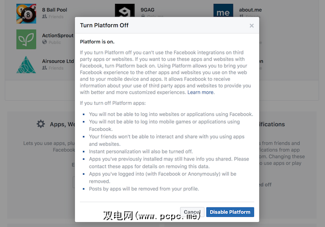 如果您决定关闭该平台 >,您将无法使用Facebook登录网站,应用程序或手机游戏。朋友无法与您互动和共享应用程序和网站。即时个性化设置已关闭。您先前使用Facebook登录的应用程序将被删除,并且应用程序在个人资料上发布的信息也将被删除。