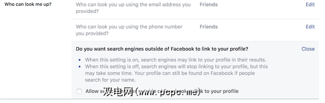 本节的最后一个选项是允许Facebook以外的搜索引擎链接到您的轮廓。如果启用,则Google之类的网站将在搜索结果中显示您的Facebook个人资料,例如您的名字。