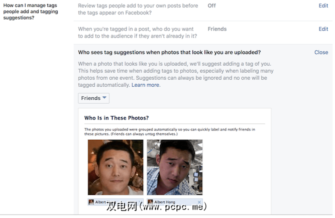 有一个选项供谁上传看起来像您的照片时看到标记建议。这样,每当上传看起来像您的照片时,Facebook都会建议使用标签。仅有两个选项:朋友或一个人。