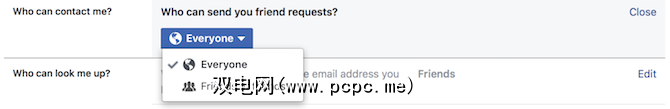 此部分下只有一个选项。这实际上是在问谁可以向您发送朋友请求?。您可以选择所有人,也可以只选择 Friends of Friends 。如果您不想公开,则最好使用后者。