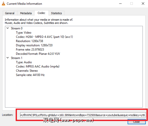 视频开始播放后,转到工具>编解码器,然后复制位置框中的链接。