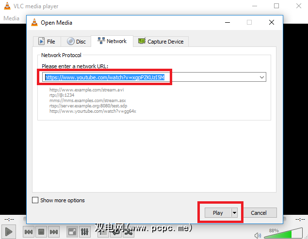 首先,启动该应用程序并转到媒体>打开网络流。粘贴要下载的YouTube视频的URL,然后点击播放。