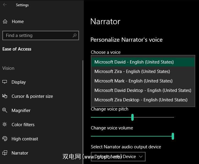 Windows 10确实包含一些额外的声音除了默认值。要更改它们,请转到设置>易于访问>讲述人,然后在个性化讲述人的声音下,从下拉框中选择新的声音。
