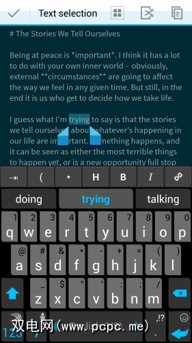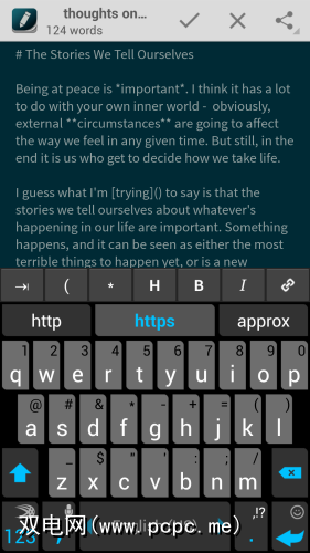 这就是写作的样子。 Swiftkey占据了屏幕的一半,并且选择了一些文本,因此我可以对其快速应用Markdown格式。键盘上方的工具栏包含Markdown所需的基本元素。点击链接按钮(最右边的按钮)时,会发生以下情况: