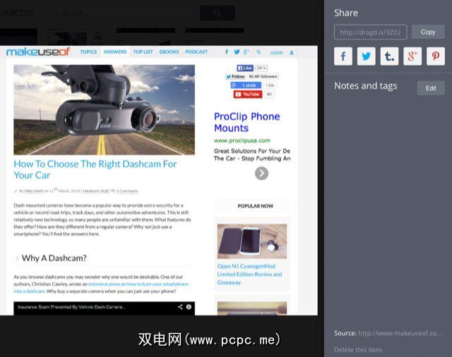 单击侧边栏中的一个文件夹将在您的Dragdis帐户中打开该内容。保存的项目包括所选内容的预览,相应的源链接以及Dragdis的链接页面,还可以共享到Google +,Tumblr和Pinterest。注释和标签可以添加到单个项目中,并且所有内容都是可搜索的。