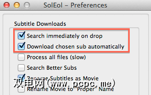 首先,进入“ SolEol首选项"窗格并确保选择了选项“ 在下拉列表中立即搜索"和“ 自动下载所选子项"。如果还没有,可能还需要选中“ 将字幕重命名为电影"或“将电影重命名为“适当的名称"",这将相反地进行。