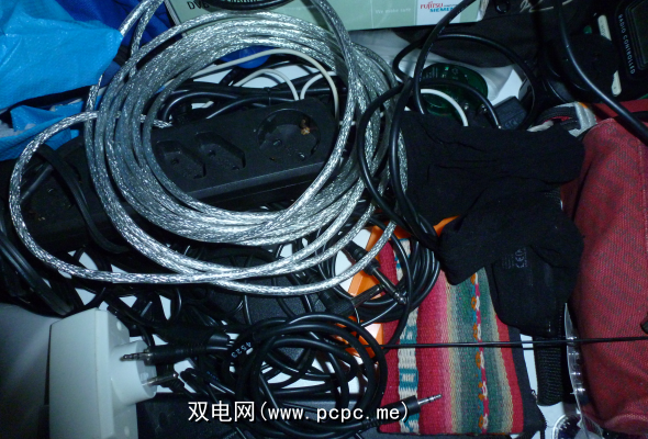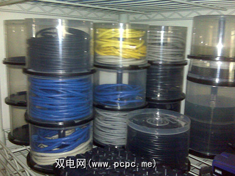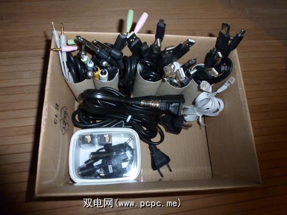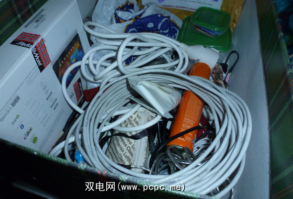 如果您的CD / DVD蛋糕盒是空的,也可以将电缆卷起来放入其中并将它们堆叠起来。特别粗,更长的电缆无法放入纸板卷中。此外,如上图所示将电缆折叠起来并不太好;正确地缠绕它们会更加柔和,并且可以延长电缆的使用寿命。不幸的是,我没有这些。