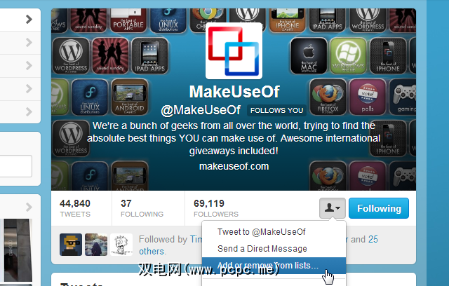 制作和使用列表非常简单。首先,只需正常访问Twitter个人资料即可。不用单击“跟随"按钮,而是单击其左侧的菜单按钮,然后选择“从列表中添加或删除"。