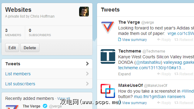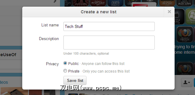 公开列表可以用作一种推荐功能。例如,您可以将自己喜欢的技术网站和博客添加到“技术资料"列表中。其他查看您的Twitter个人资料的人可以查看此列表,并查看有关技术方面的建议对象。他们还可以订阅您的列表。您的列表将显示在其“列表"部分中,并且您添加到其中的任何人也会显示在其列表中。例如,我们在PCPC.me维护一个人员列表,其中包含我们所有作家的Twitter帐户。您可以订阅此列表,以查看我们的PCPC.me个人帐户中正在发布的内容。