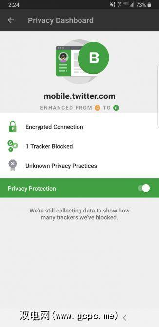 该应用程序和台式机版本均根据隐私权对每个网站进行分级。网站的等级将显示在您浏览器中网站URL的左侧。单击等级,您将看到DuckDuckGo被阻止的跟踪器数量,连接是否被加密以及网站具有哪种类型的隐私惯例。