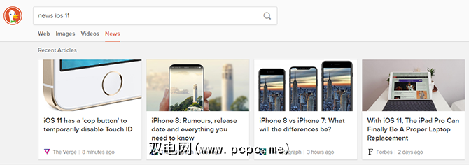 在DuckDuckGo上搜索字词时,您不会获得任何新闻结果。另一方面,Google会插入与您的搜索相关的三个热门新闻。如果您希望在DuckDuckGo上获得类似的体验,只需在搜索字词的开头或结尾添加 News (新闻)字样,您的搜索结果将包含来自各种新闻来源的不到100个故事。