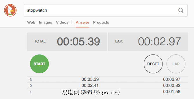 如果您需要跟踪完成任何给定任务所花费的时间,可以使用DuckDuckGo秒表。只需在搜索引擎上搜索秒表即可。