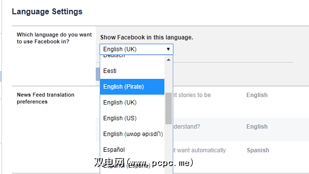 Facebook提供了100多种不同语言的应用程序。但是,如果英语是您的母语,则您还有两个选择:英语(海盗)和英语(颠倒)。