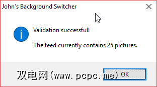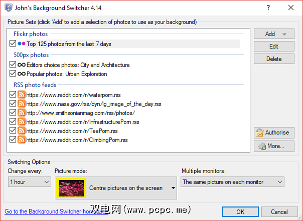 成功!按确定。 Waterp0rn提要已成功添加到John的背景切换器中。继续并添加更多资源。我还添加了来自SFW P0rn网络,NASA每日图片供稿和《史密森尼杂志》照片供稿的其他供稿。除此之外,我还添加了一些500px的供稿,以及过去7天的前125张Flickr图片。我的JBS图片集列表现在看起来像这样: