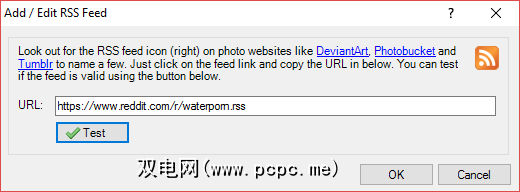 在此示例中,我们将添加 RSS照片供稿。从添加菜单中选择RSS照片供稿。这将打开添加/编辑RSS Feed 面板。我将添加Waterp0rn subreddit。转到subreddit并复制URL。将URL粘贴到“添加/编辑RSS Feed"面板中。现在,从URL中删除最后的“ /",并添加“ .rss "。您的网址现在应如下所示: