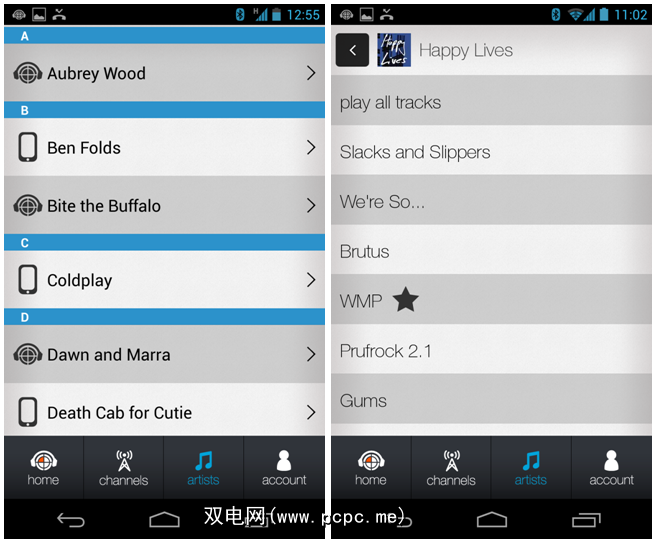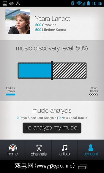 扫描完成后,有趣的部分开始了。完成后,您将看到Earbits的简单界面,其中包括四个选项卡:“主页",“频道",“艺术家"和“帐户"。开始播放音乐后,可以向右滑动播放器来返回此主屏幕。