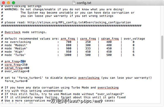 在文本编辑器中打开文件 config.txt 。在超频模式设置下,您会看到推荐的超频配置。在它们下面是您更改设置的地方。我将我的设置为高。