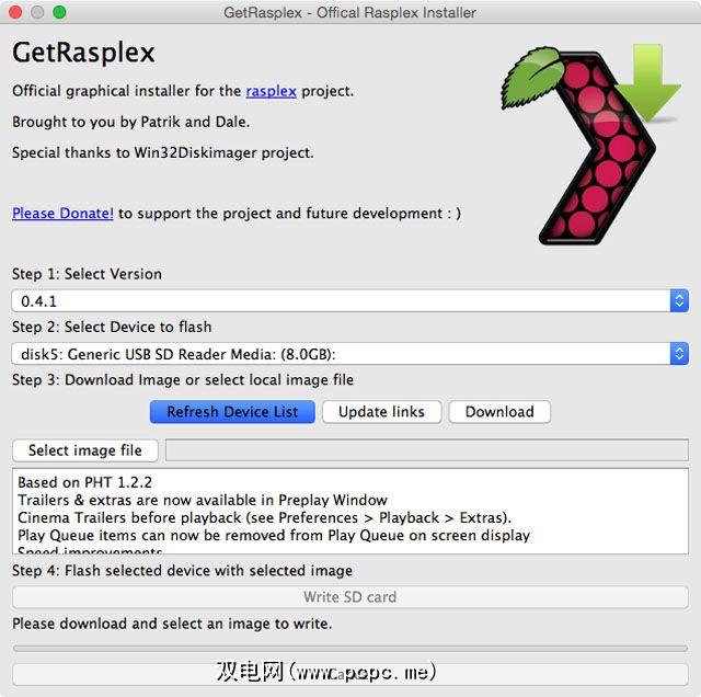 在RasPlex安装程序中,选择可用的最新版本的RasPlex,MicroSD卡,然后单击< strong>下载。下载完成后,点击写入SD卡。这将在RasPlex上安装SD卡。