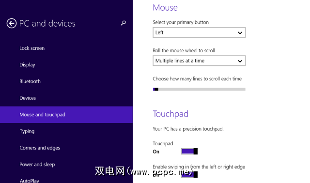要进行检查,请打开PC设置屏幕-按 Windows键+ C 或从右侧向右轻扫,点击“设置",然后点击“更改PC设置"。导航到 PC和设备>鼠标和触摸板,并确保已启用“触摸板"选项。